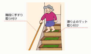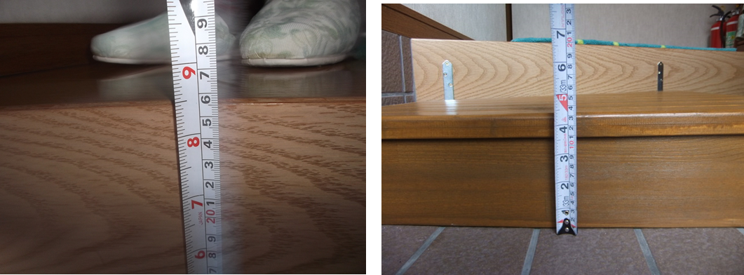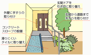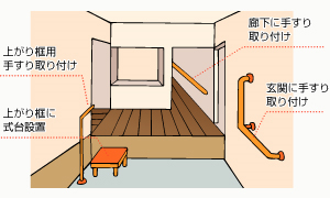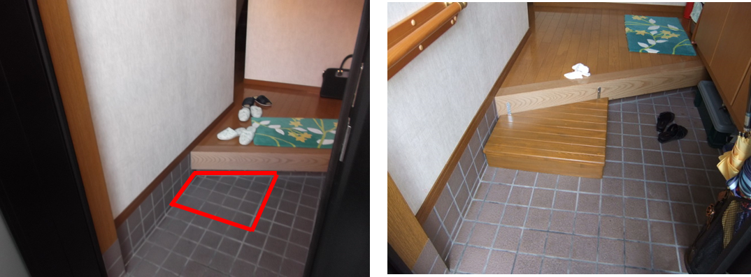 玄関外(ポーチ)・上がりかまちに手すり・踏み台を設置することで、安全に移動できるにする。