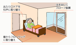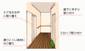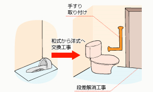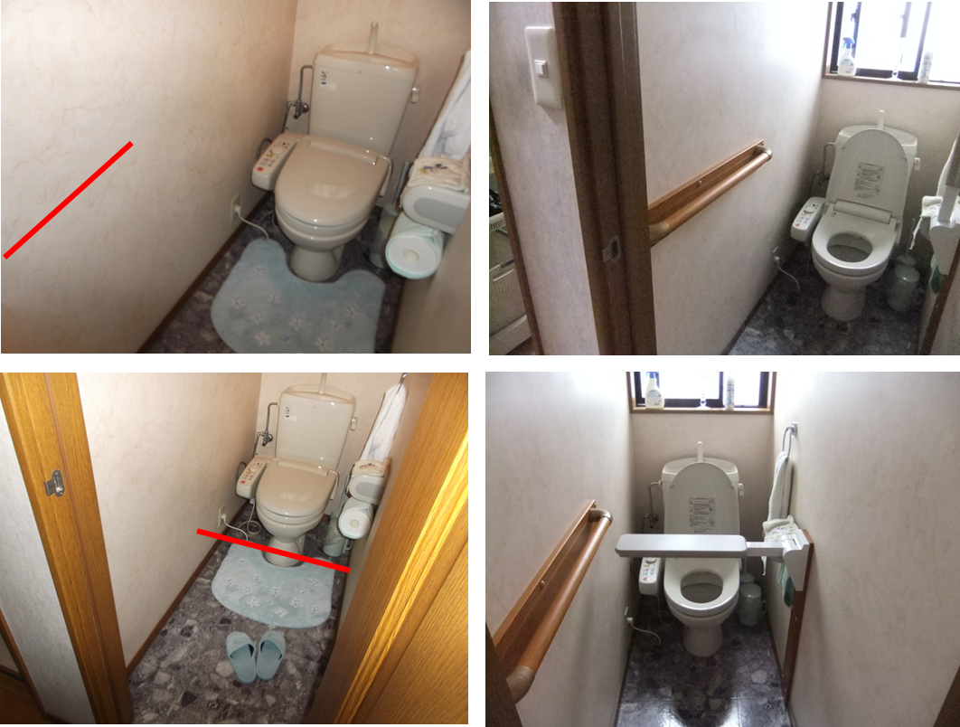 トイレに手すりを取り付けることで、ドアの開閉・移動。立ち座り・衣服の着脱を容易にし、排泄が安心してできるようにする。