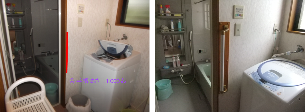 浴室ドア横に手すりを設置し転倒防止する。