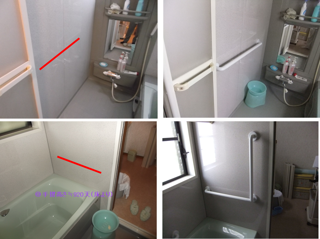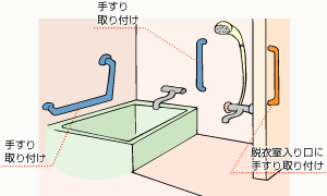 浴室内に手すり設置で転倒防止。浴槽脇に手すりを設置し浸かっている時の立ち座り、姿勢保持を可能にする。